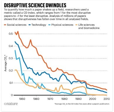 This week’s post continues by showing one of the casualties from this iceberg of bad papers: Again, the title of an article, published on January 4, 2023 in Nature, says it all: “Disruptive” science has declined – and no one knows why, the proportion of publications that send a field in a new direction has plummeted over the past half-century.
